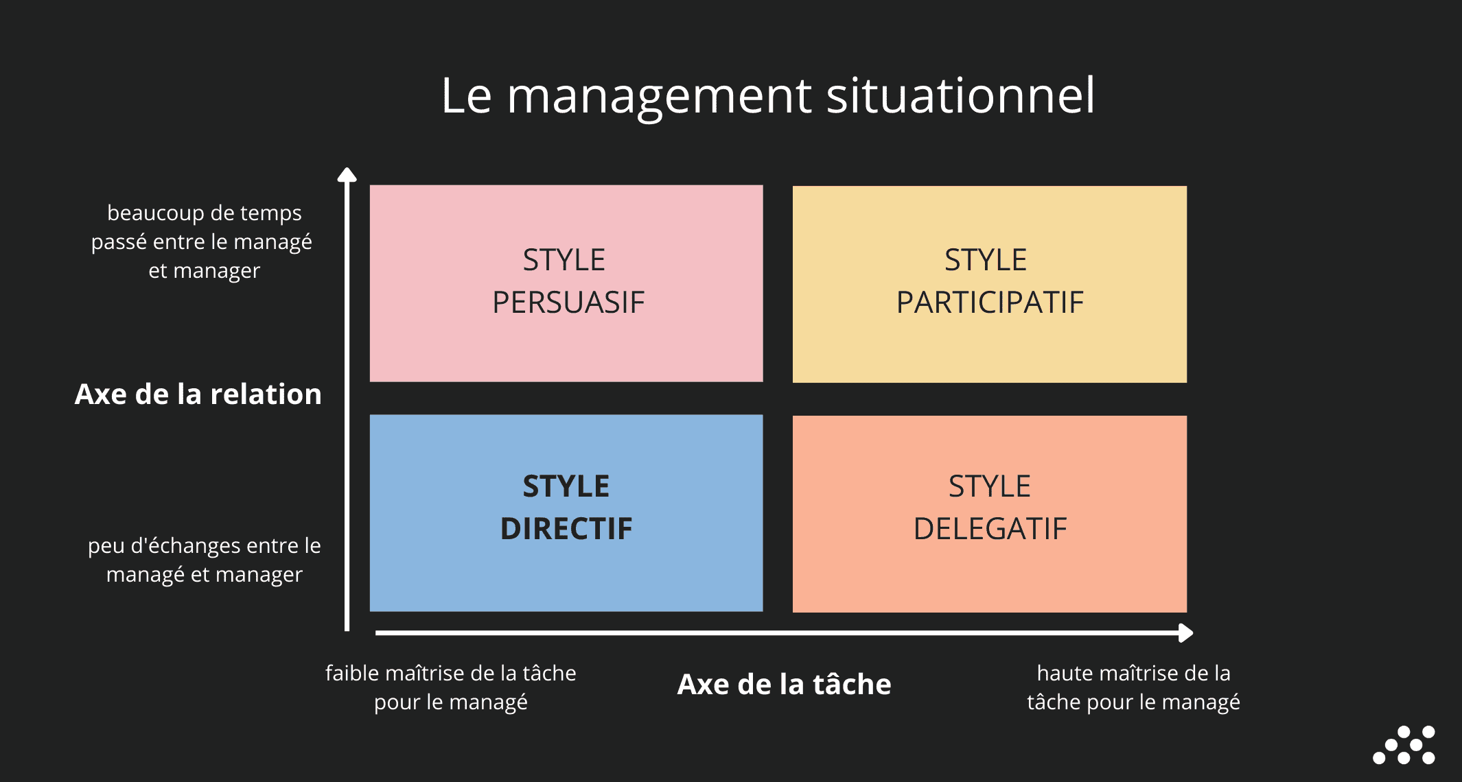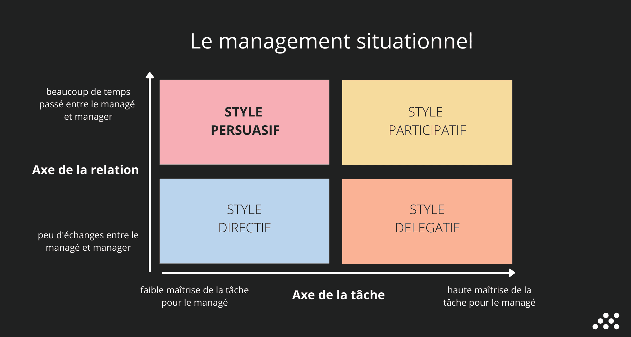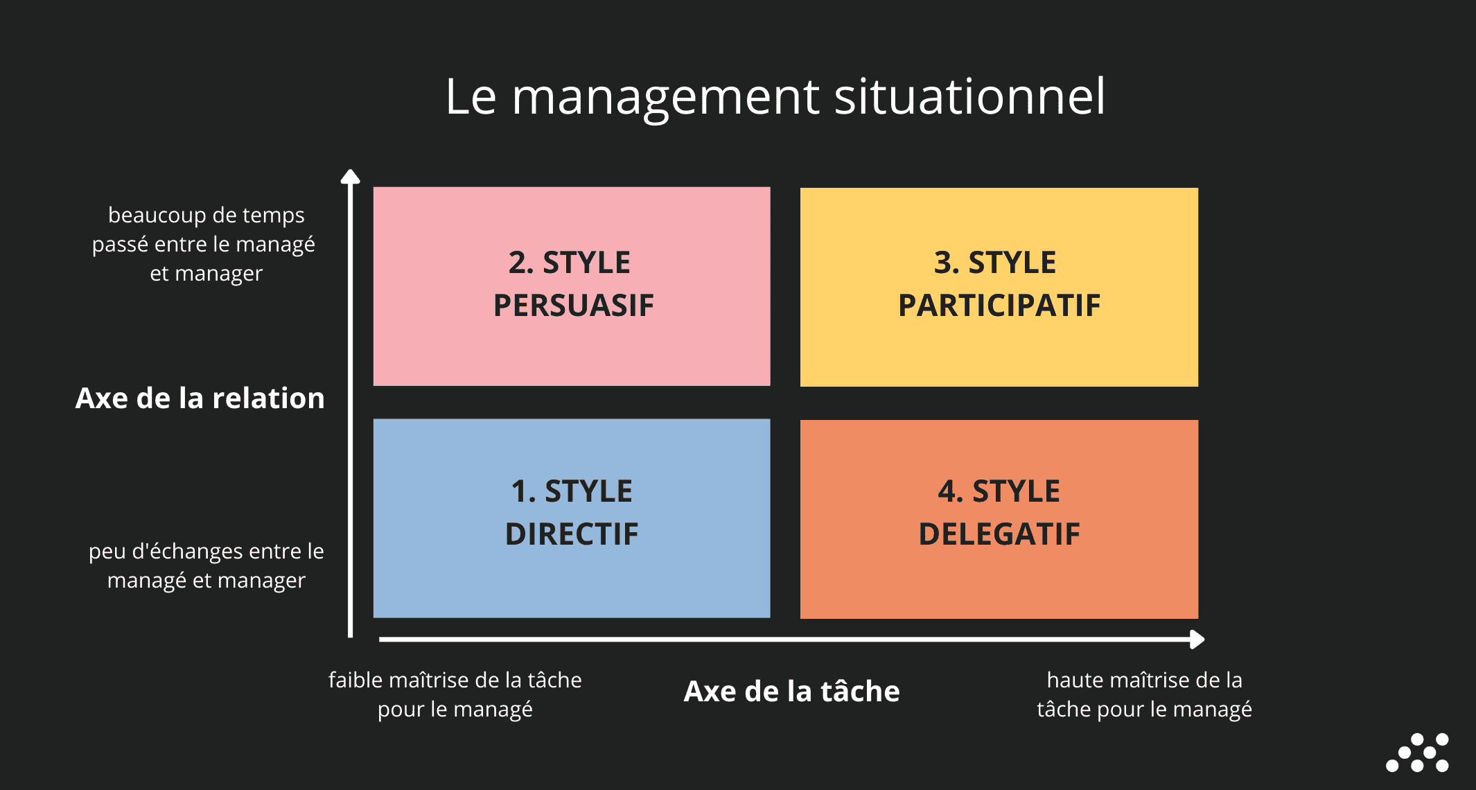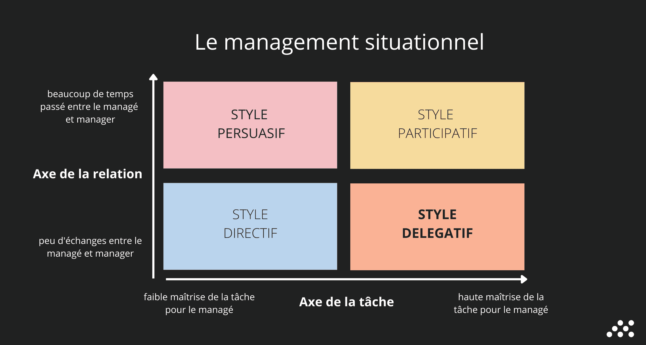 These two experts explain that depending on the situations encountered, one management style may be more appropriate than another. To determine the most effective one, they rely on two parameters: the relationship between the manager and the employee, as well as the employee’s behavior toward the task to be carried out. Based on these criteria, we get a four-quadrant matrix, each designating a very specific management style: directive, persuasive, participative, and delegative.