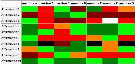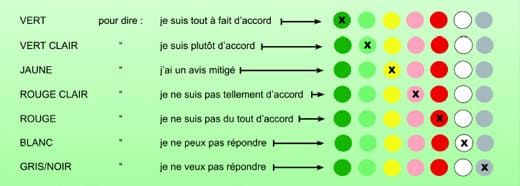 Les adultes étant davantage capables d’apporter des nuances dans leurs réponses, c’est une plus large palette de couleurs qu’elle a choisi de proposer à ces “grands enfants”. Ainsi, lors de ces ateliers en entreprise, les apprenants ont le choix entre le vert foncé qui exprime un “oui, je suis d’accord avec l’affirmation”, le vert clair qui désigne “oui, je suis d’accord avec l’affirmation mais...”, le jaune qui signifie “oui, je suis d’accord et je ne le suis pas”, le rose qui veut dire “non, je ne suis pas d’accord mais...” et le rouge qui exprime un non-radical. Pour les élèves de primaire, Hélène a volontairement limité le choix à trois : le vert (=oui), le jaune (=oui et non) et le rouge (=non). Il lui est arrivé d’ajouter par moment le blanc, qui faisait office de joker, lorsque l’utilisateur ne savait pas quoi répondre ou ne voulait pas répondre.