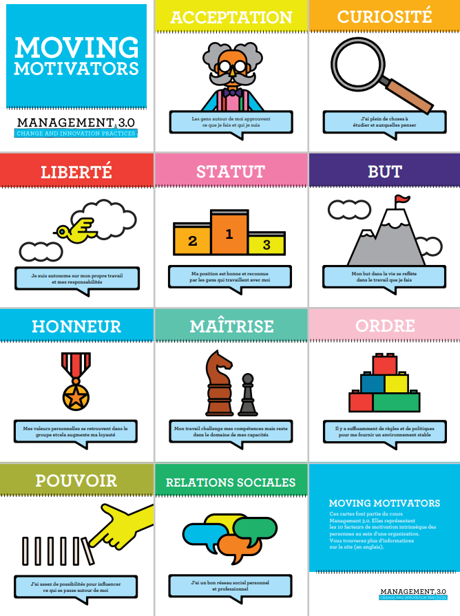 Jurgen Appelo, un spécialiste en management agile, aussi auteur d'un livre intitulé “Management 3.0” (publié en 2010), théorise les “Moving Motivators”. Ce concept repose sur l'identification de 10 grandes motivations intrinsèques, et s'oppose ainsi aux motivations extrinsèques qui elles procurent une satisfaction pour des raisons exterieures comme la récompense (financière, matérielle…), la pression sociale, l'approbation d'une tierce personne. Les motivations intrinsèques vont influencer les comportements des individus tant dans les sphères professionnelles que personnelles. Avec les Moving Motivators, les 10 motivations intrinsèques sont représentées sous la forme de cartes. Chacune symbolisant une motivation spécifique : l'acceptation, la curiosité, la liberté, le statut, le but, l'honneur, la maîtrise, l'ordre, le pouvoir et les relations sociales.
