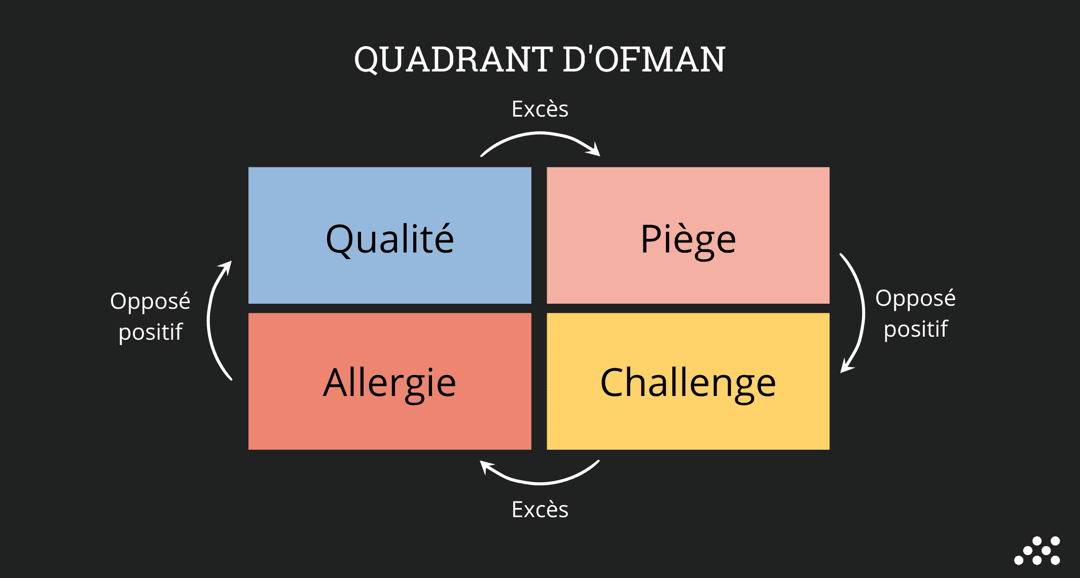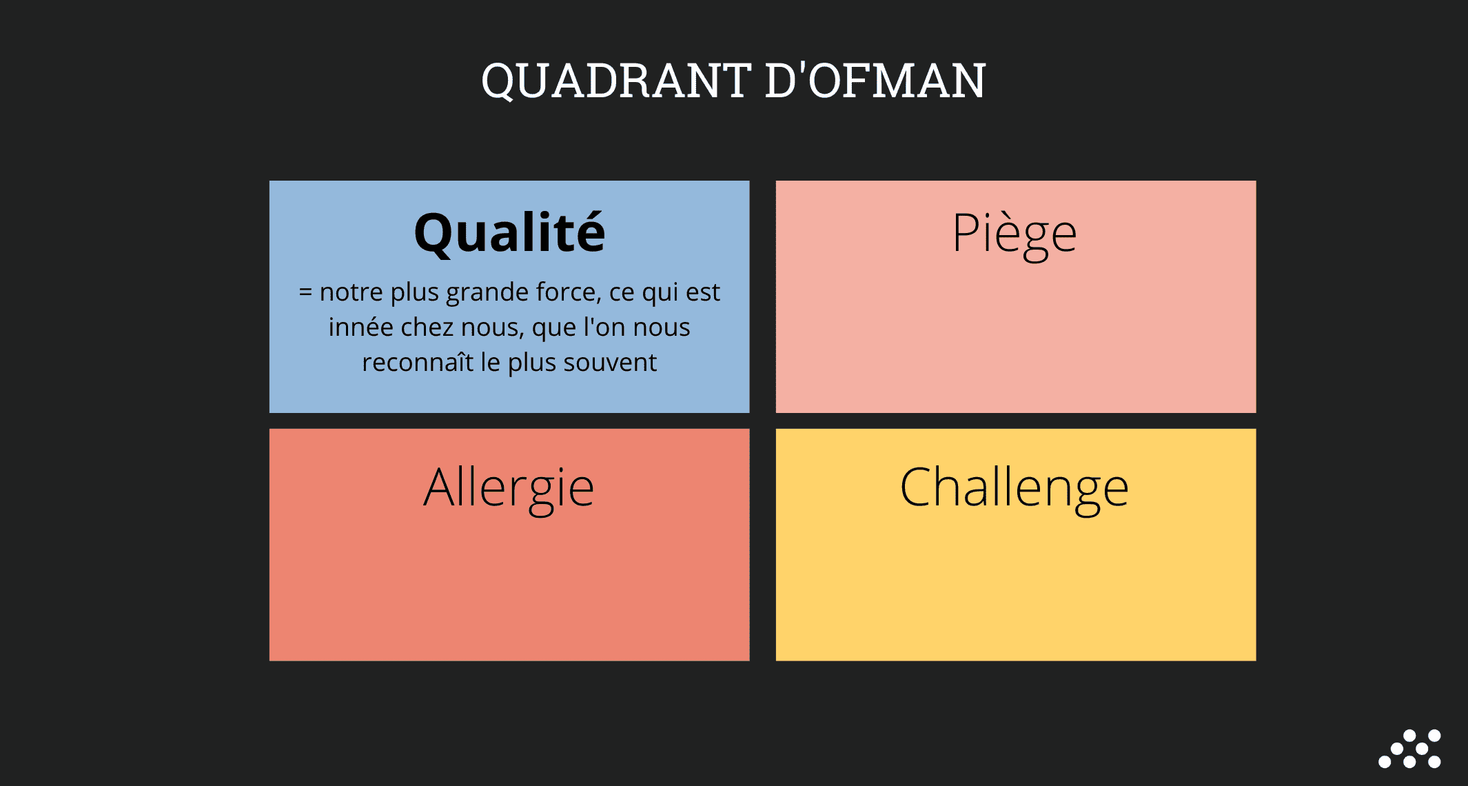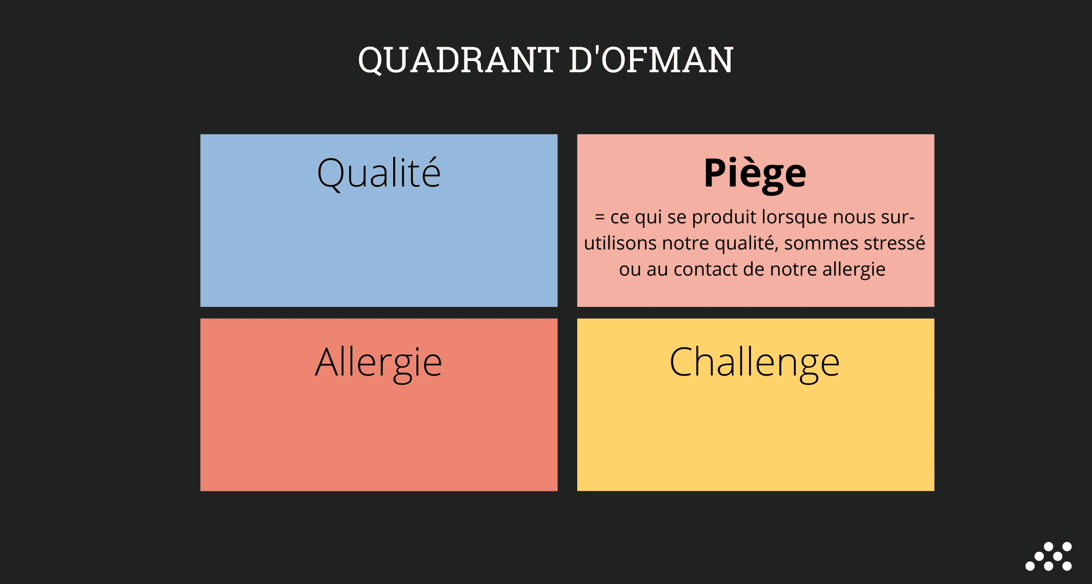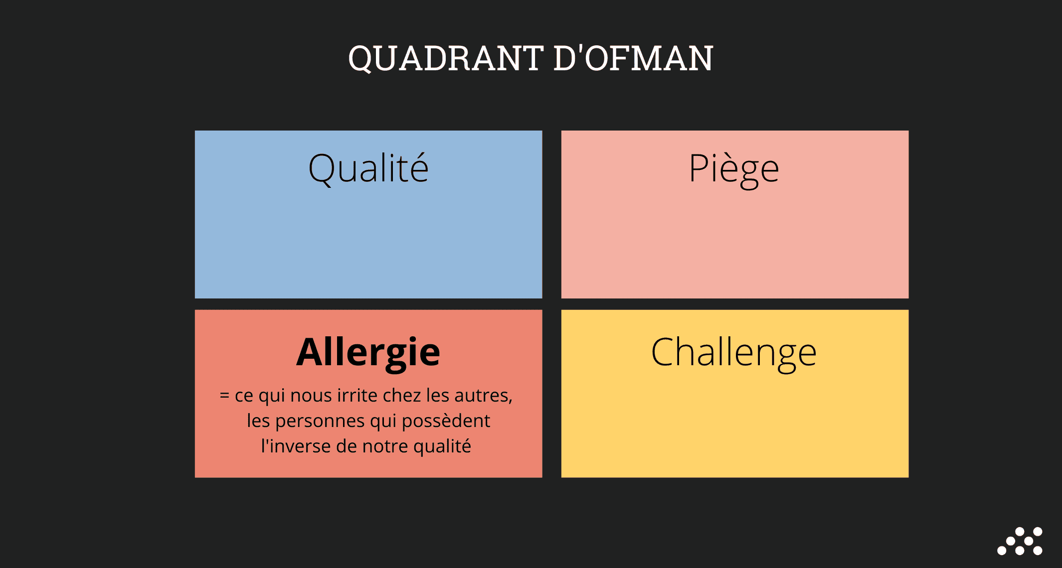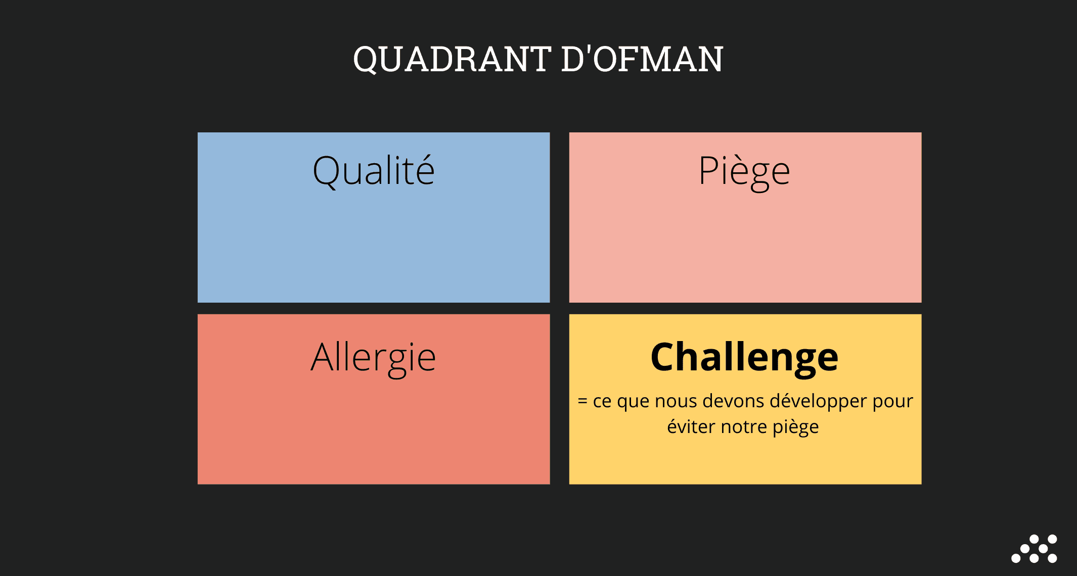 Le quadrant d’Ofman est un outil pensé et théorisé en 1992 par Daniel Ofman, un Néerlandais qui souhaitait comprendre le développement des organisations et amener chaque individu à relever ses principales forces, ses faiblesses, les qualités qu’il devrait développer et les attitudes qui l’insupportent. Qualité Fondamentale - Piège - Challenge - Allergie : tels sont les 4 points, mis en exergue par Ofman. Nous vous les détaillons ci-dessous :